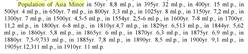 The encoding of this dataset carries different attributes in seperate rows, instead of columns, so preprocessing was necessary. We filter out population and territory data for Asia Minor, adjust the population for the current size of TR, ~800K sq meters. This way we are always looking at the same area, no matter under which gov that happened to b around, however big or small in that region.
