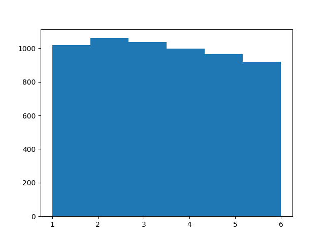 Throw a 6-sided die 1000 times (numbers below are from software generator), histogram rolls,
