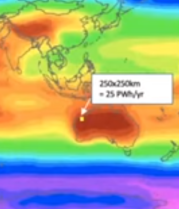 According to McFarlane, that patch of 250 km by 250 km can generate 25 Petawatt-hours in a year. More than enough for the entire world. See video.
