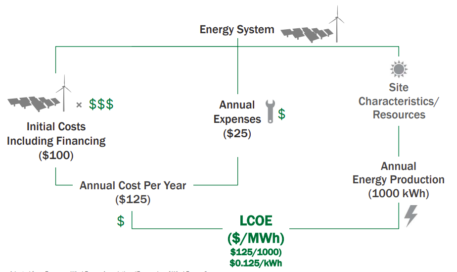 LCOE measures lifetime costs divided by energy production. Calculates present value of the total cost of building and operating a power plant over an assumed lifetime. Allows the comparison of different technologies (e.g., wind, solar, natural gas) of unequal life spans, project size, different capital cost, risk, return, and capacities (DOE).
