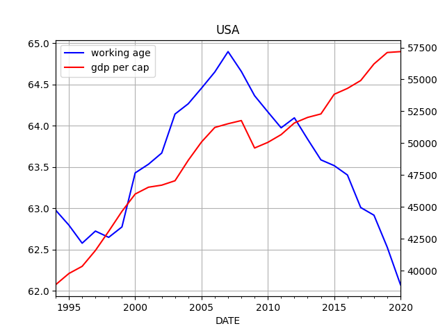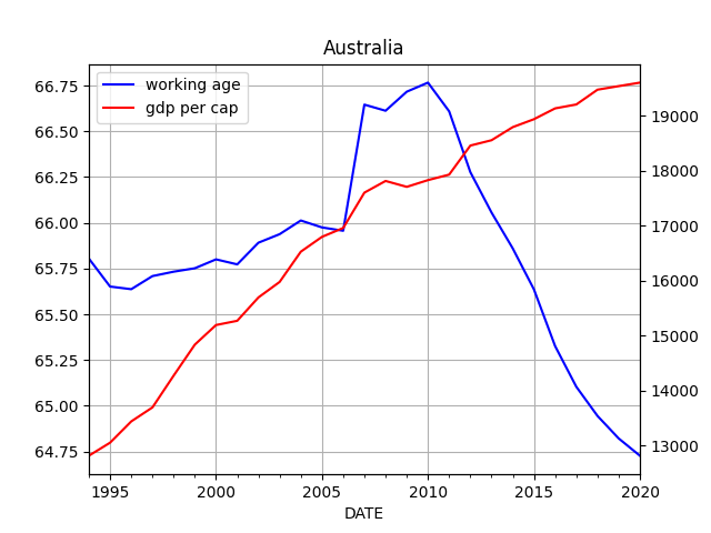 I did some data wrangling below, for US, JP, Oz. I fetched working age population, total population, and GDP; then I plot working age pop ratio, against GDP per capita.