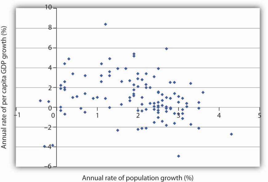 "[Graph below] plots growth rates in population versus growth rates in per capita GDP from 1975 to 2005 for more than 100 developing countries. We do not see a simple relationship. Many countries experienced both rapid population growth and negative changes in real per capita GDP. But still others had relatively rapid population growth, yet they had a rapid increase in per capita GDP. Clearly, there is more to achieving gains in per capita income than a simple slowing in population growth"