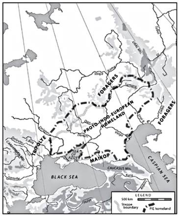 Knowing that we are looking for a society with a specific list of material culture items and institutionalized power distinctions is a great help in locating the Proto-Indo-European homeland. We can exclude all regions where hunter-gatherer economies survived up to 2500 BCE. That eliminates the northern forest zone of Eurasia and the Kazakh steppes east of the Ural Mountains. The absence of honeybees east of the Urals eliminates any part of Siberia. The temperate-zone flora and fauna in the reconstructed vocabulary, and the absence of shared roots for Mediterranean or tropical flora and fauna, eliminate the tropics, the Mediterranean, and the Near East. Proto-Indo- European exhibits some very ancient links with the Uralic languages, overlaid by more recent lexical borrowings into Proto-Uralic from Proto-Indo-European; and it exhibits less clear linkages to some Pre—or Proto-Kartvelian language of the Caucasus region. All these requirements would be met by a Proto-Indo-European homeland placed west of the Ural Mountains, between the Urals and the Caucasus, in the steppes of eastern Ukraine and Russia.