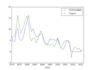 The graphs are somewhat close, but they diverge at certain points. For example during the 80s (Volcker years) the FF rate was much higher than necessary. In the early 2000s, TR prescribes higher rate, but FF was much lower. Lower-than-necessary rates was one of the main causes of the subprime crisis, as everyone knows. 2009 is weird, here TR says "go negative" - and this is precisely the time when "unconventional monetary programs" were started such as QE. For 2016, formula says FF should be higher, and Yellen is desparetely trying to go there, but the market gyrations of Jan-Feb after small-ish hikes scared everyone, so they seem to have slowed down.