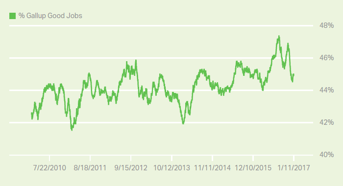 Gallup defines a good job as 30+ hours per week for an employer who provides a regular paycheck. [.. and] is calculated as a percentage of the total population.