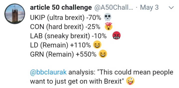 Blair is talking abt "the tally" for Remain side having to go up (he is hoping) for EU parlm. elections. He seems to count cons on Brexit pile tho. There is now a Brexit Party, all pro Brexiters would have gone there. The remaining cons cannot automatically be considered Brexiter