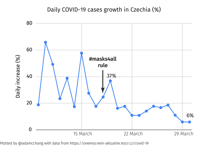 Here's what happened in the Czech Republic after they imposed mandatory mask-wearing on March 18th. The daily increase in cases has dropped from over 20% before the #masks4all rule to just 6%"