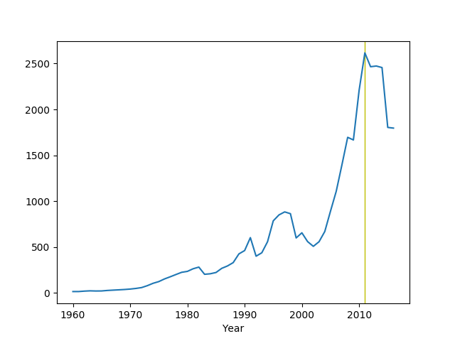 plt.axvspan(2011,2011,color='y')