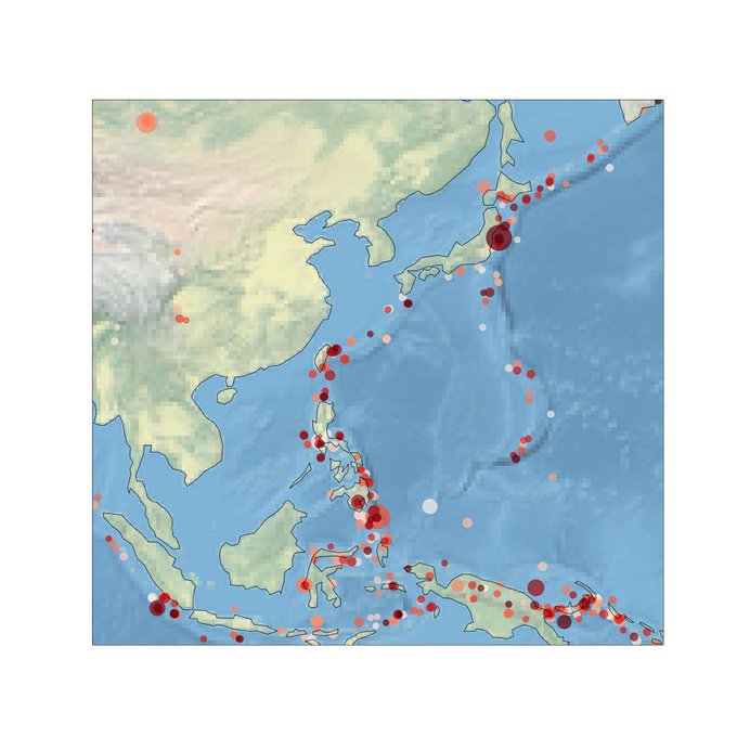 Some earthquake plotting.. EQ of past 90 days, old to new is colored light to dark, circle width is severity. The hope was maybe seeing a geo progression of eq culminating with a final big one at the end.. Always looking for an angle here..