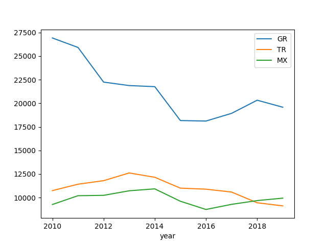 dat = wb.download(indicator='NY.GDP.PCAP.CD', country=['TR','GR','MX'], start=2010, end=2020)