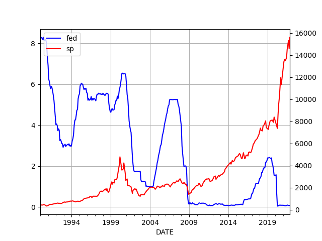 ax2 = df.sp500.plot(color='red', grid=True, label='sp',secondary_y=True)