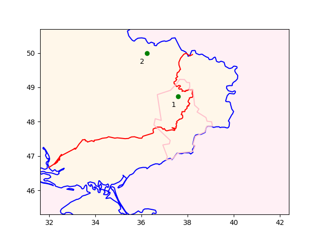 geo = [(48.7309677, 37.5836740),(49.992383834083824, 36.23871126844284)]