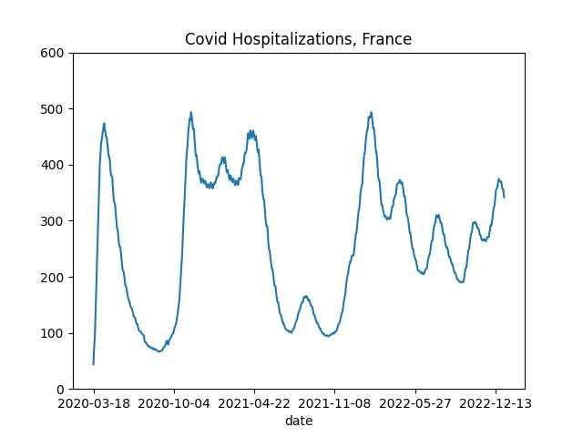dff.plot(title='Covid Hospitalizations, France', ylim=[0,600])