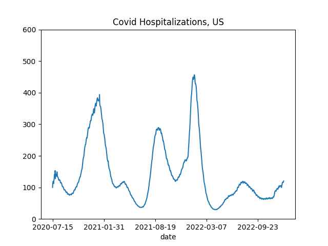 dfu.plot(title='Covid Hospitalizations, US', ylim=[0,600])