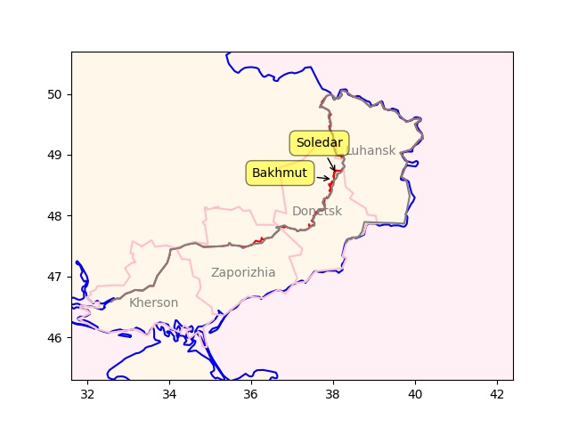 Latest frontline in Ukraine (in red), compared to 2022/11 (gray). Gains in Soledar, also south of Bakhmut. RU will surely attempt to encircle BKM. Some gains in Zaporizhia too? The start of something from there perhaps, with plans of pushing towards the north.