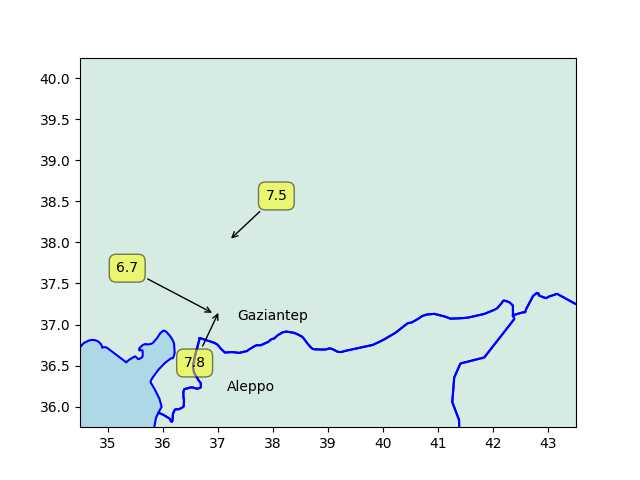plt.text(37.170340, 36.19170861,'Aleppo')