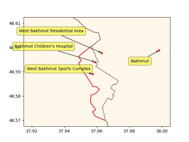 u.sm_plot_ukr1('ukrdata/fl-0521.csv','ukrdata/fl-0516.csv',["West Bakhmut Sports Complex","Bakhmut Children's Hospital","West Bakhmut Residential Area","Bakhmut"],48.59,37.96,zoom=0.005)