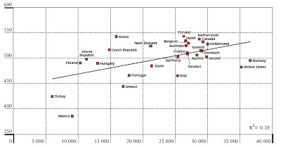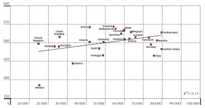 İlginç bir grafik ise, milli gelir ile PISA sınav notu arasındaki korelasyon (büyük hali için tıklayın):