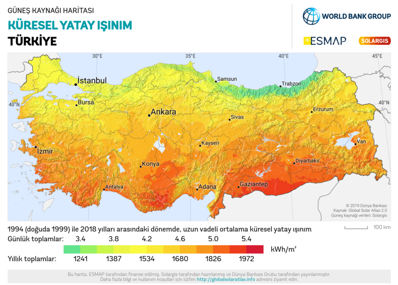 Watt/m2 birimine çevirmek gerekirse en yüksek yerde 225 Watt/m2. Dünyada en yüksek nokta 300 Watt/m2, Avutralya ve Afrika'da.